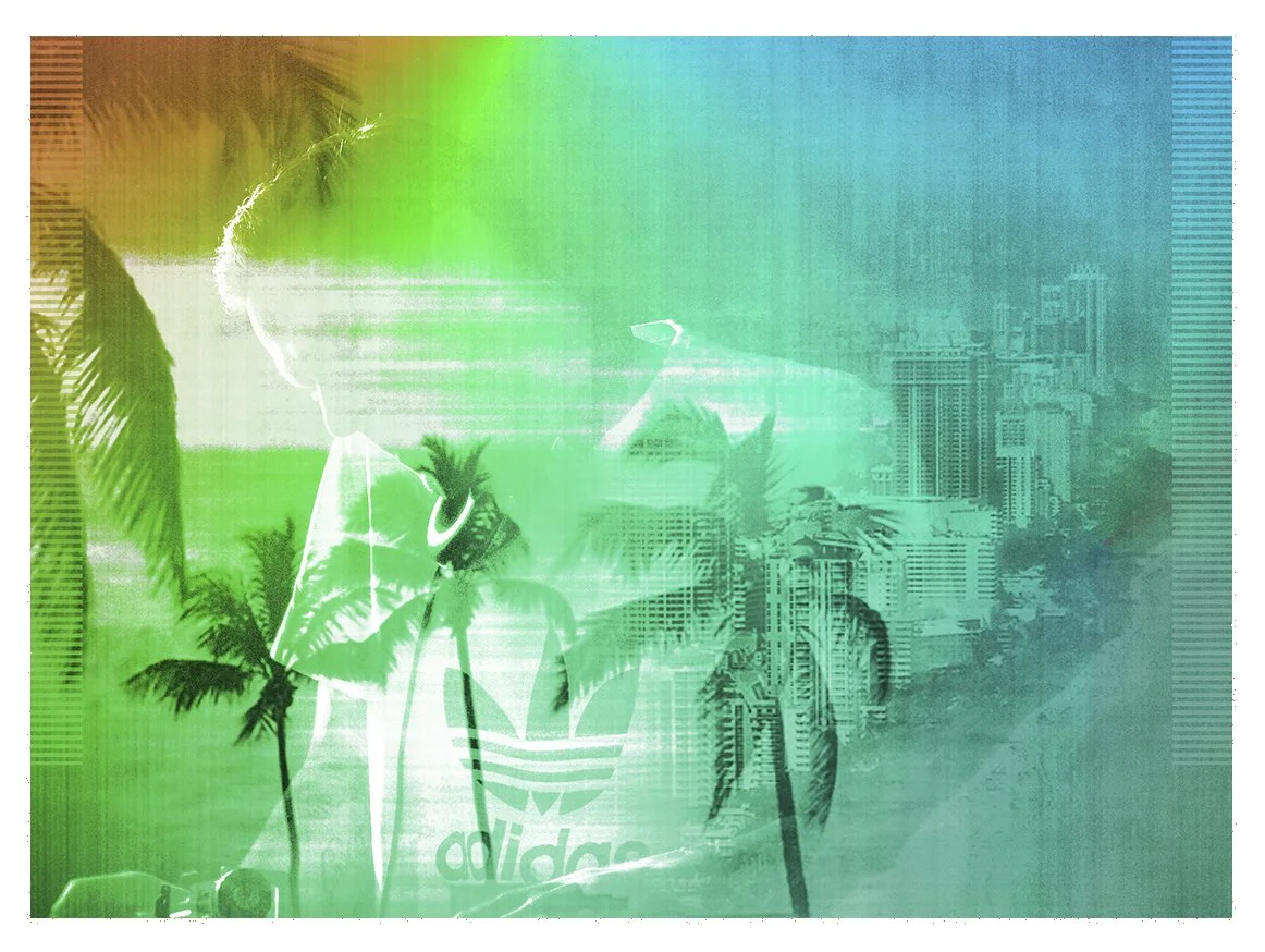 Print campaign for an event in a tropical location for ADIDAS in Portland, Oregon. Client requested colorful, bold, and tropical with branding materials. We delivered this lush print collage with palms and brand assets. Original digital illustration and layering.